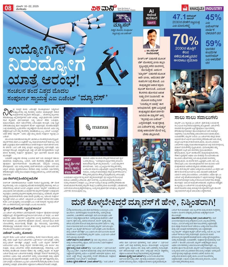 ಮಾರ್ಚ್ 6 ರಂದು ಬಿಡುಗಡೆಯಾದ ಮ್ಯಾನಸ್, ಜಾಗತಿಕ ಎಐ ಲೋಕದಲ್ಲಿ ಸಂಚಲನ ಸೃಷ್ಟಿಸಿದೆ; ಎಐ ದೈತ್ಯ ಕಂಪನಿಗಳ ಮುಖ್ಯಸ್ಥರಲ್ಲಿ ನಡುಕ ಹುಟ್ಟಿಸಿದೆ; ಎಐ ಕುರಿತು ಆತಂಕ ಹೊಂದಿದ್ದ ವಿಜ್ಞಾನಿಗಳಲ್ಲಿ ಭೀತಿ ಹೆಚ್ಚಿಸಿದೆ. ಉದ್ಯೋಗ ಜಗತ್ತಿನಲ್ಲಿ ಕಾಣದ ಅಲೆಯೊಂದು ಸುನಾಮಿಯಂತೆ ಅಲ್ಲೋಲ ಕಲ್ಲೋಲ ಸೃಷ್ಟಿಸಿದೆ. ಮ್ಯಾನಸ್ ಕೇವಲ ಹೊಸ ಎಐ ಅಪ್ಲಿಕೇಶನ್ ಅಲ್ಲ; ಸುಧಾರಿತ ಚಾಟ್ಬಾಟ್ ಕೂಡ ಅಲ್ಲ; ಇದು ಕೃತಕ ಬುದ್ಧಿಮತ್ತೆಯ ಹೊಸ ಅವತರಣಿಕೆಯೂ ಆಗಿರದೆ ಸಂಪೂರ್ಣ ಹೊಸ ವರ್ಗವೇ ಆಗಿದೆ. ಈ ವರ್ಗವೇ ಎಐನ ಬಳಕೆ ಮತ್ತು ಭವಿಷ್ಯದ ಅಭಿವೃದ್ಧಿಯನ್ನು ನಿರ್ಧರಿಸುತ್ತದೆ. ಇದು ಮನುಷ್ಯನ ನೆರವಿಲ್ಲದೆ, ಮಧ್ಯಸ್ತಿಕೆಯಿಲ್ಲದೆ, ಅಷ್ಟೇ ಏಕೆ ಅವರ ಮೇಲ್ವಿಚಾರಣೆಯೇ ಇಲ್ಲದೆ ಹೇಳಿದ ಕೆಲಸವನ್ನು ಸಂಪೂರ್ಣ ಸ್ವತಂತ್ರವಾಗಿ, ಸ್ವಂತ ನಿರ್ಧಾರಗಳ ಮೂಲಕ ಮಾಡಿ ಮುಗಿಸುತ್ತದೆ.