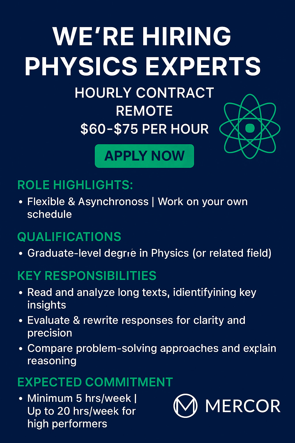 Mercor, in collaboration with a leading AI lab, is seeking physicists to join a new high-impact research project.